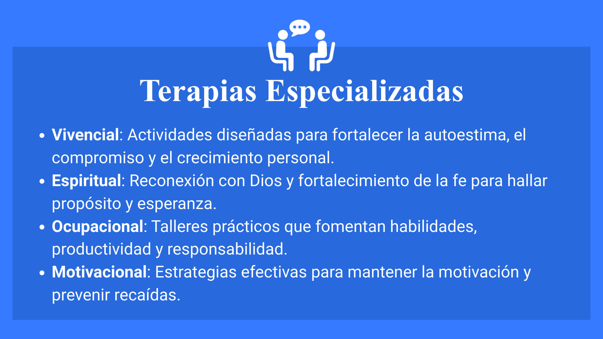 Ofrecemos un programa integral de rehabilitación para adicciones al alcohol y otras drogas, enfocado en la salud física, mental y emocional.